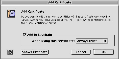 Step 12: Keychain Creation (Part 5) In the "Add Certificate" settings window, verify "Add to keychain" is checked, with "Always trust" selected in the "When using this certificate" drop list. Once verified, click "OK."
