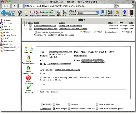 The security of 4SecureMail is obvious to potential users. But what's not immediately obvious, and what's totally cool, is all the ways 4SecureMail can obliterate junk mail problems and protect you from virus threats. |