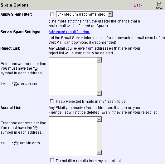 - Apply Spam Filter - Select the checkbox, choose the level and then "save" to turn this option on.