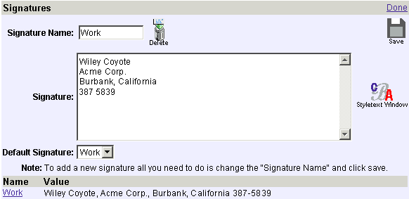 Here you can Name, Compose, Delete and Save signatures.